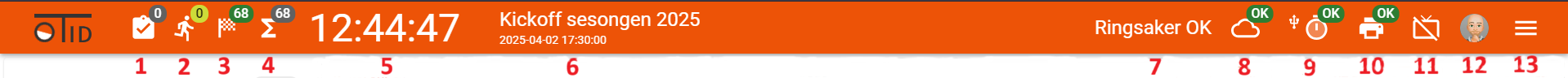 1for tidtaking) - Kommet status. Antallet som er sjekket og ute å løper (Ved klikk vises de i rute